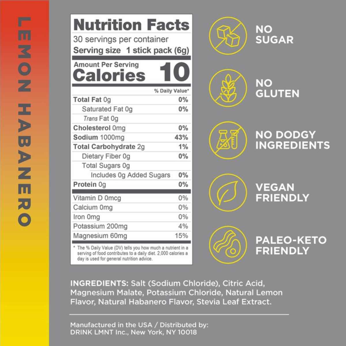 Lemon Habanero: Salt (Sodium Chloride), Citric Acid, Magnesium Malate, Potassium Chloride, Natural Lemon Flavor, Natural Habanero Flavor, Stevia Leaf Extract.