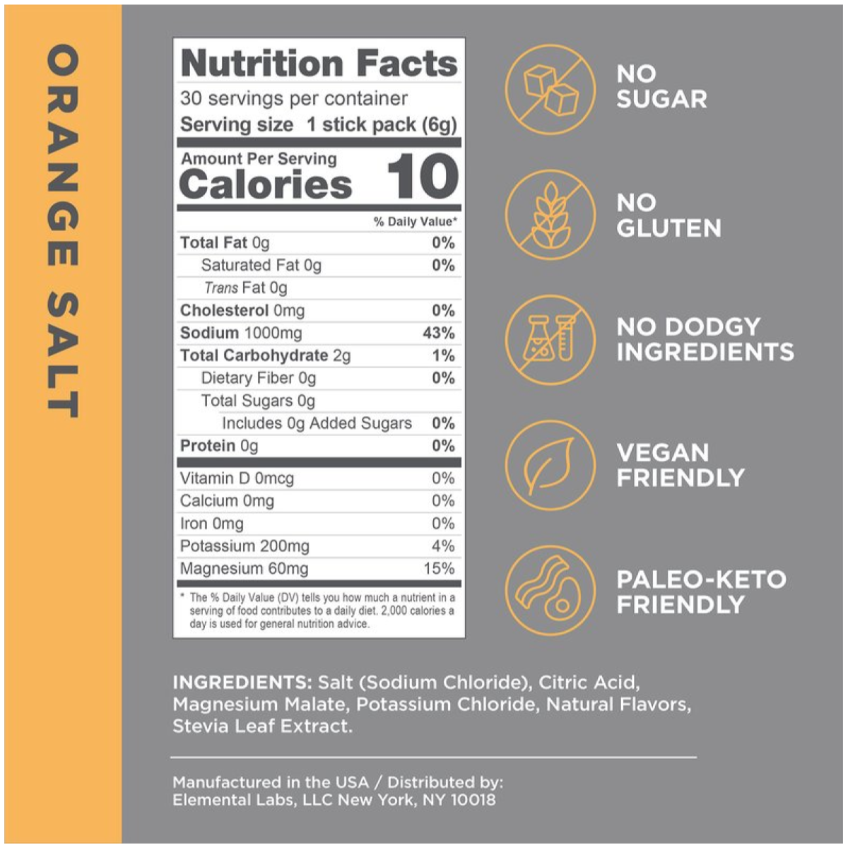 Orange Salt: Salt (Sodium Chloride), Citric Acid, Magnesium Malate, Potassium Chloride, Natural Flavors, Stevia Leaf Extract.
