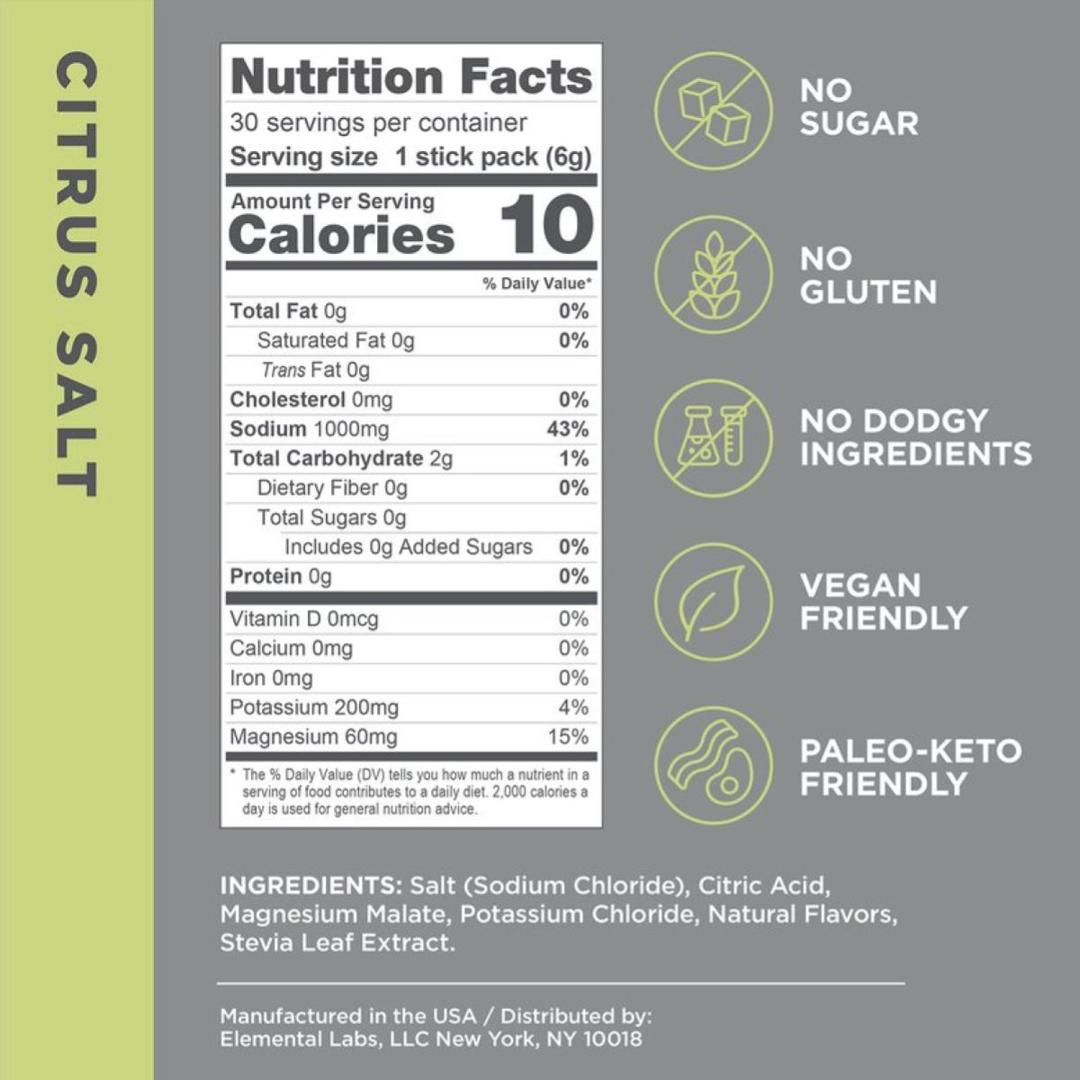 Citrus Salt: Salt (Sodium Chloride), Citric Acid, Magnesium Malate, Potassium Chloride, Natural Flavors, Stevia Leaf Extract.