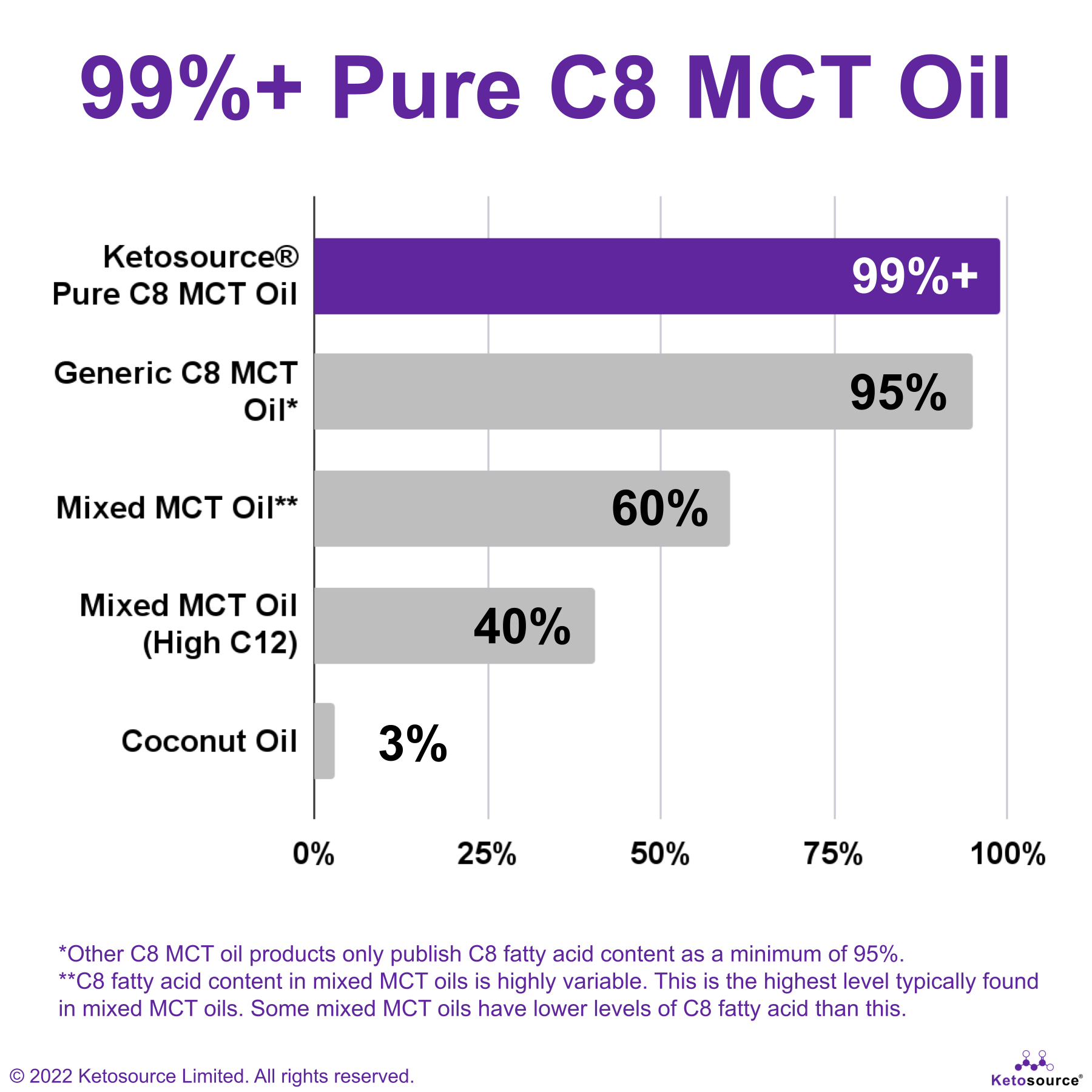 - Active Ingredient Purity. Pure C8 MCT oil has the highest purity level of the active ketone boosting ingredient C8 MCT.